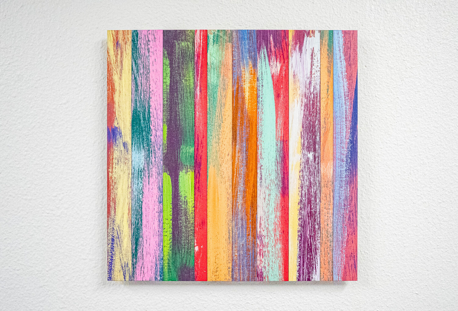 Bei den vorliegenden Werken haben wir in verschiedenen Farben vorgemalte Malgründe zu einem Malworkshop mit Mitarbeitenden mitgebracht. Darauf sind mit Pinsel und selbstgewählten Farben (Lieblingsfarben) grobe Pinselstriche entstanden. Diese Platten haben wir anschliessend in längliche, verschieden breite Streifen geteilt. In unserem Atelier haben wir diese Streifen zu Bildern komponiert. Neben spannenden Werken entsteht so auch eine symbolische Ebene: Erst das Zusammenspiel aller Einzelteile ergibt ein interessantes Gesamtbild.